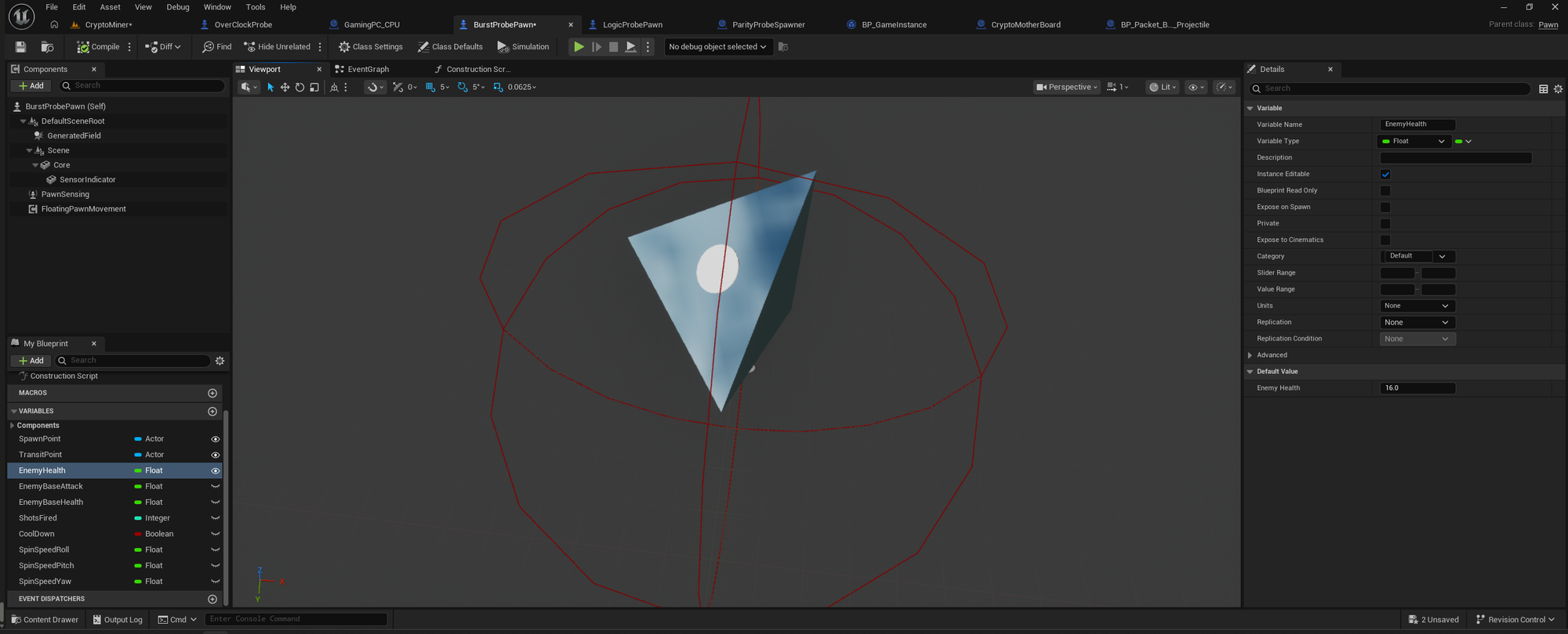 The Burst Probe will start out as a copy of the standard Parity Probe. The way I have the system designed is that each level controls the launching of any probes to a spawner. Which probes and which spawners are involved is determined by the Phase Rules. When a new enemy type is added to the game, a few things need to happen. First, it's gets added to the Phase Rules as an integer. Then the probe spawner gets updated with the new enemy type. The level blueprint's function to process phases gets updated to handle the new enemy so it can be spawned. Once that is all set up, the new enemy can be spawned in any level that accounts for it. And since I copy levels progressively, all enemies are accounted for.