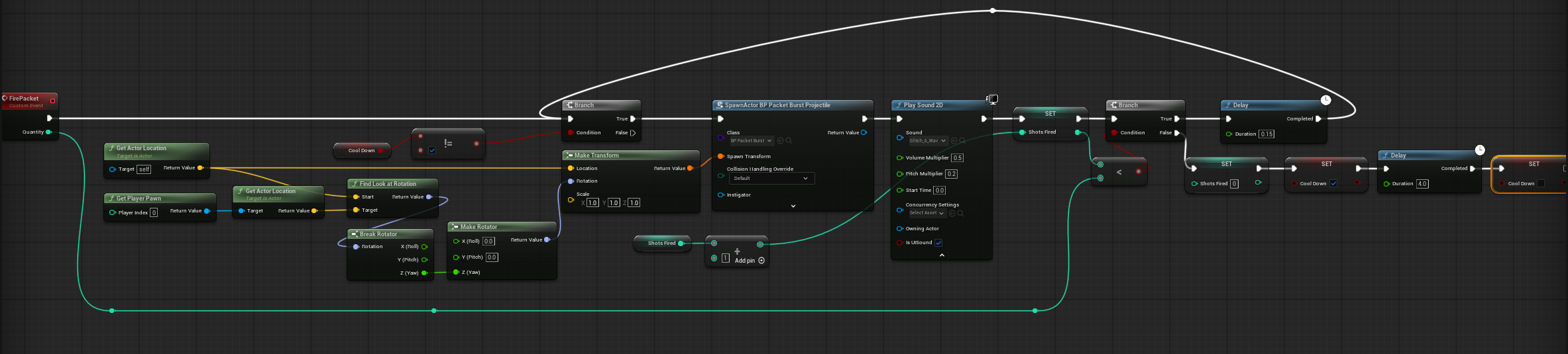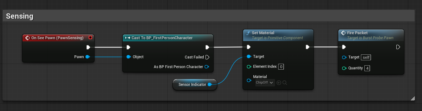 The probe uses PawnSensing to determine of the player is nearby. And if they are, it executes the FirePacket event. This is the same process that other probes have followed except for the action of firing something at the player.